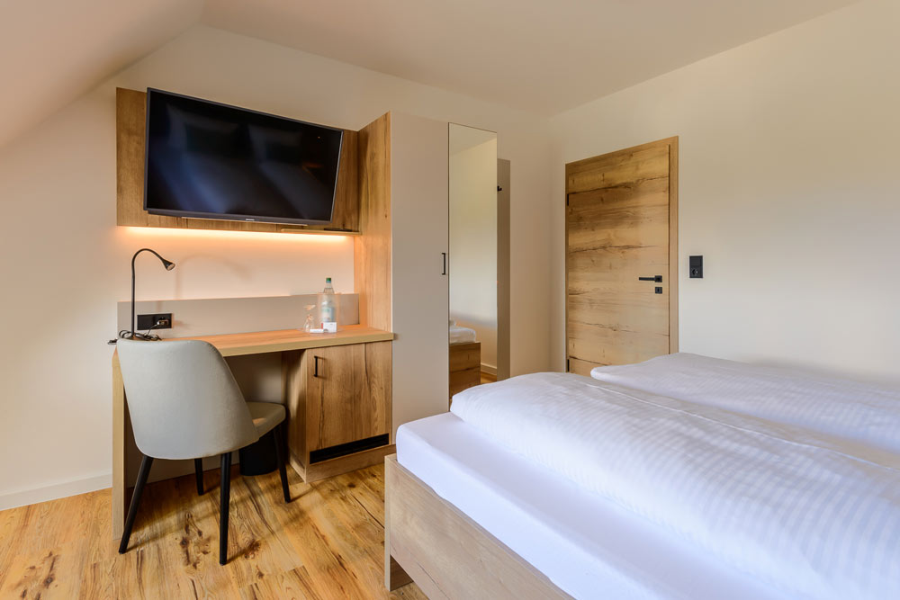 Alle Zimmer sind mit einem Doppelbett ausgestattet sowie TV, WLAN, Tisch & Stühle, Safe, Dusche, Föhn, Kosmetikspiegel